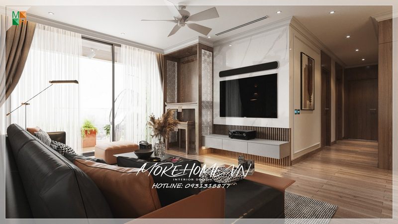 Kệ tủ tivi trong phòng khách được thiết kế đơn giản nhưng vẫn phù hợp với không gian và đạt đến sự hiện đại.